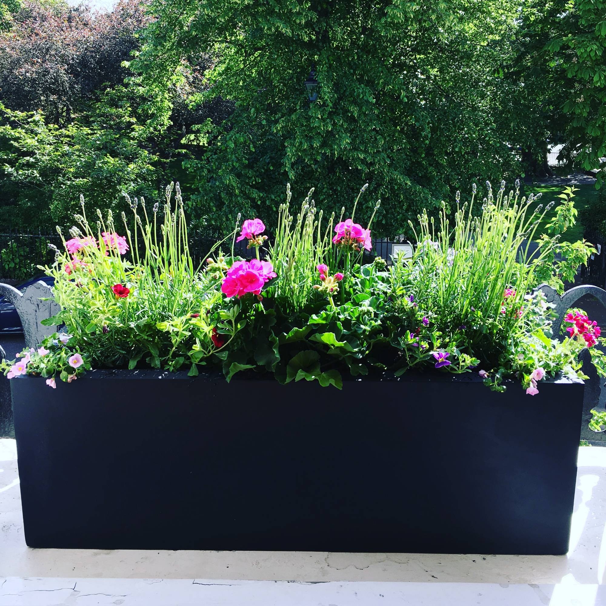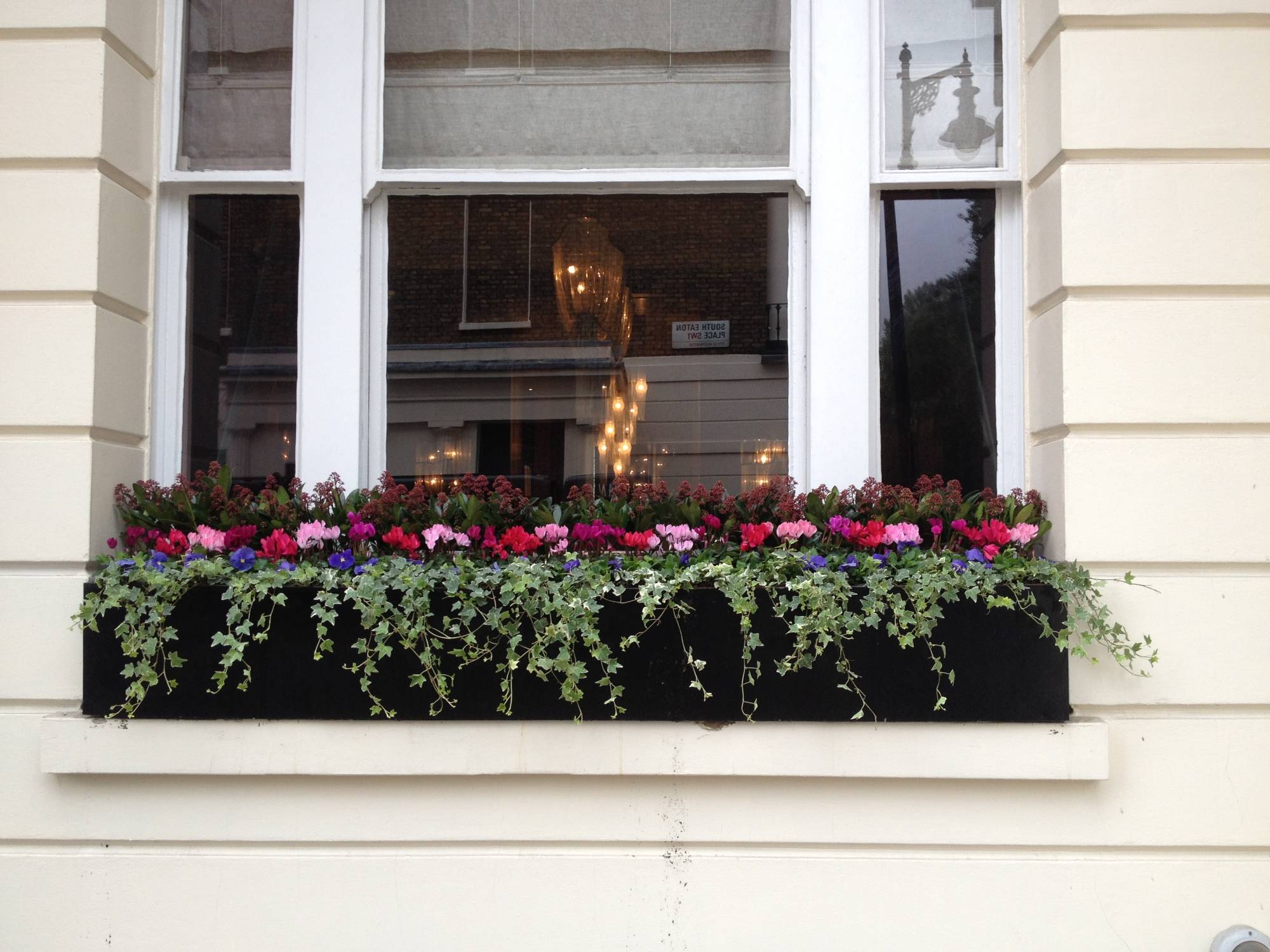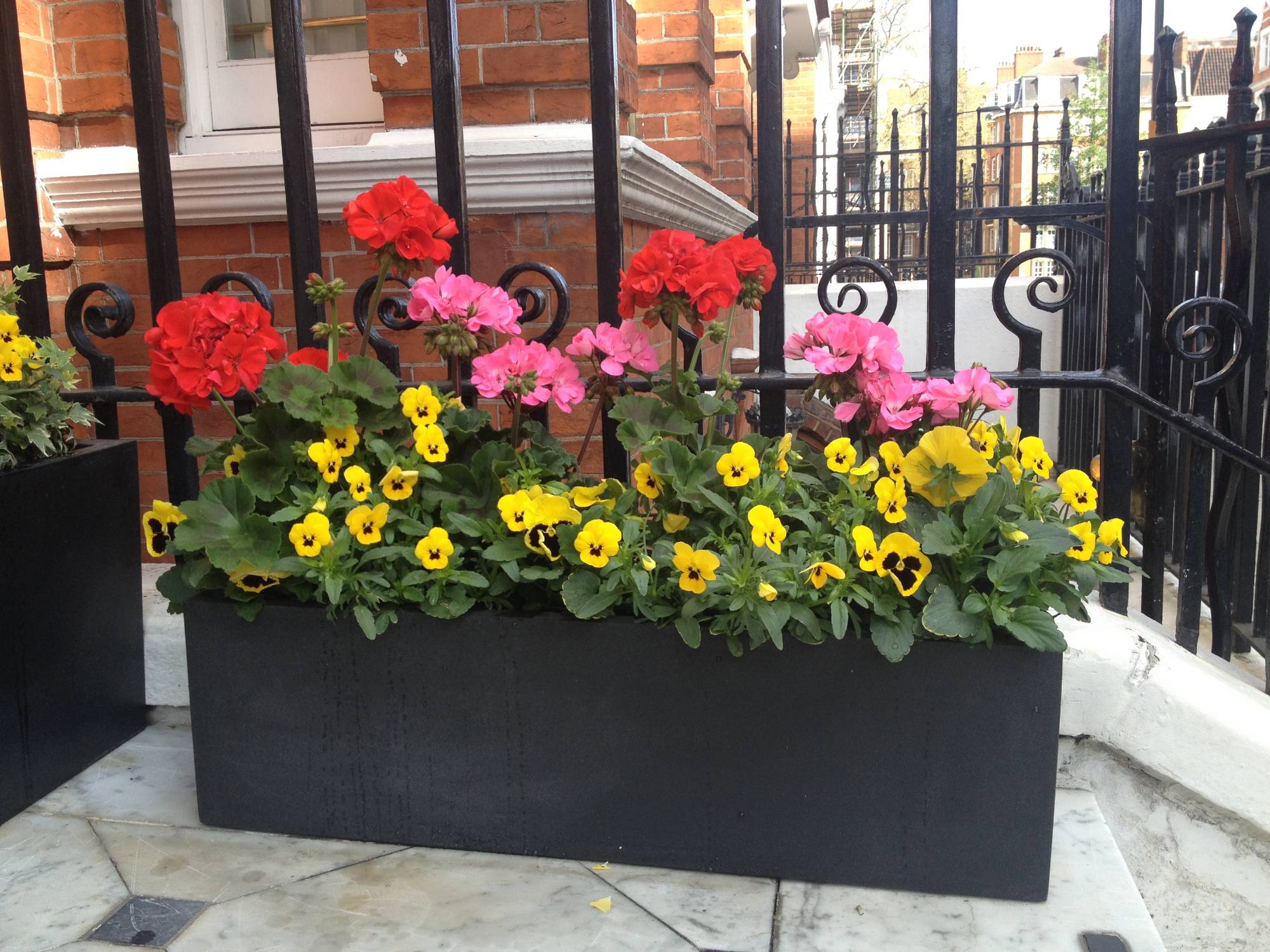 Our exterior services include window boxes, hanging baskets and plant displays with seasonal flowering plants or specimen shrubs to complement your building entrance, roof terrace, balcony or courtyard.