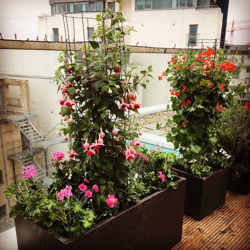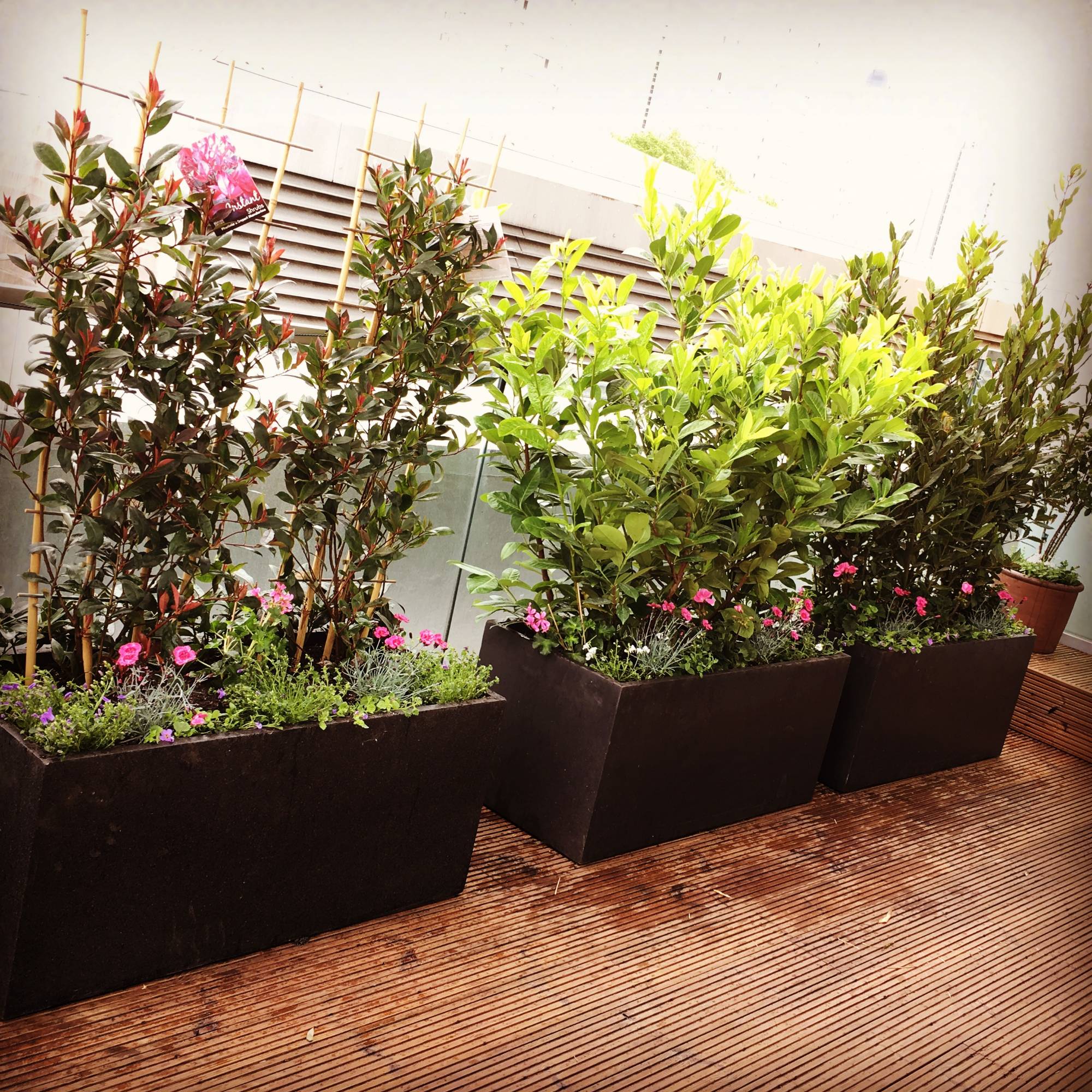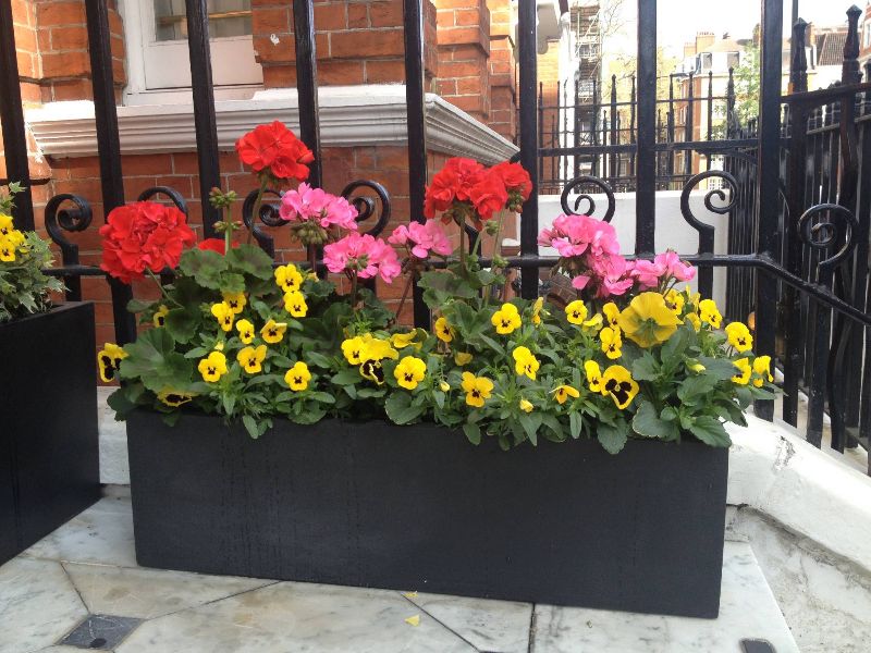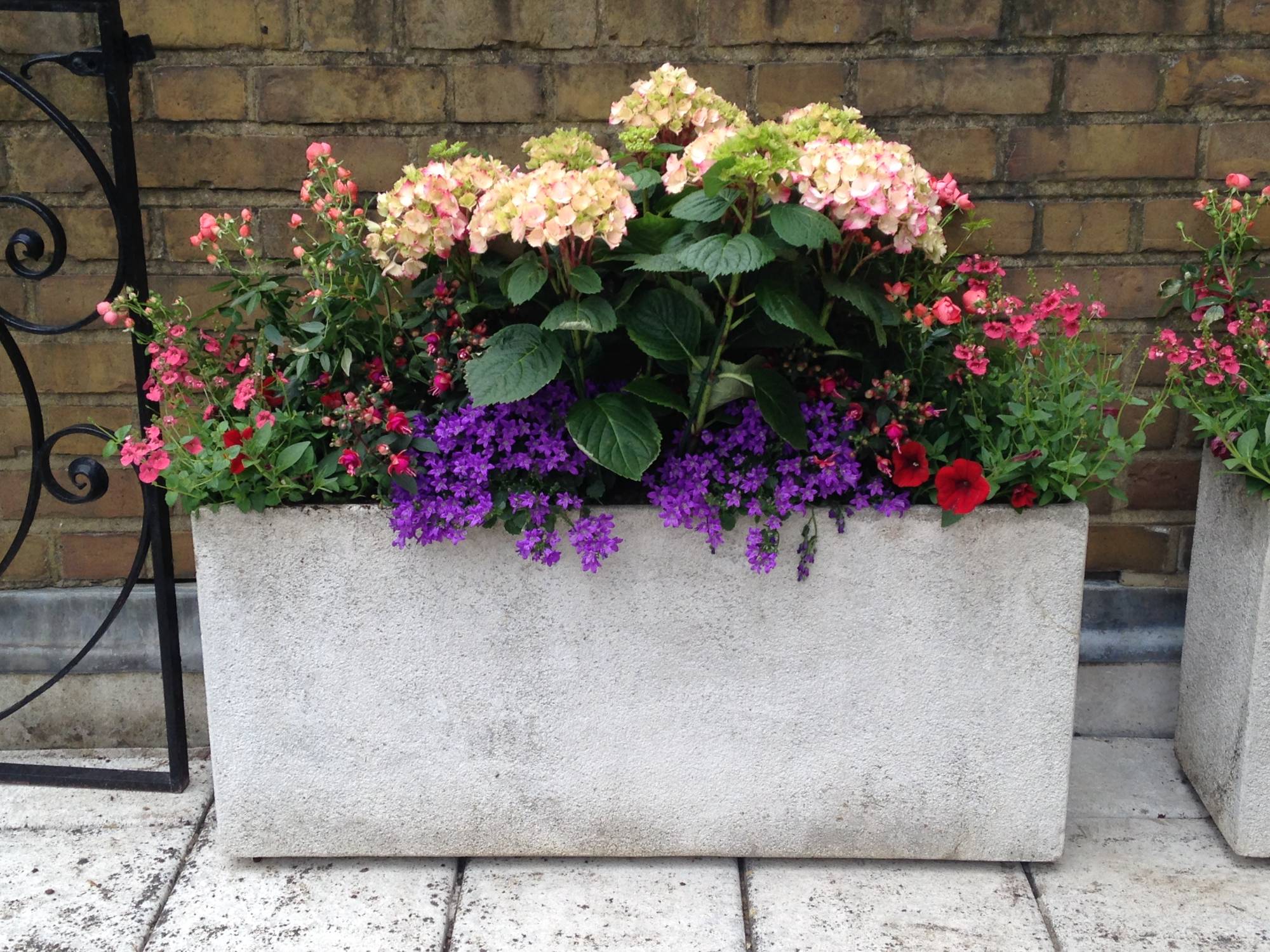 Our exterior services include window boxes, hanging baskets and plant displays with seasonal flowering plants or specimen shrubs to complement your building entrance, roof terrace, balcony or courtyard.